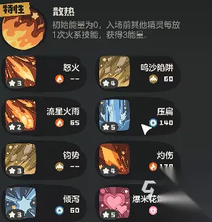 谈起这精灵技能的搭配,这技能还是老样子需要携带四个,那么来看这四个技能,这其中第一个技能是一个纯伤害类型的技能,该技能叫做火云车,这技能在释放以后可以对敌方精灵造成高额物理伤害。