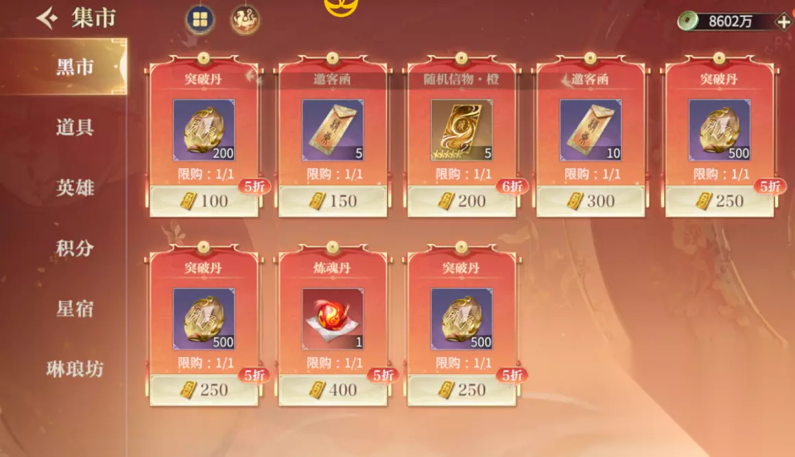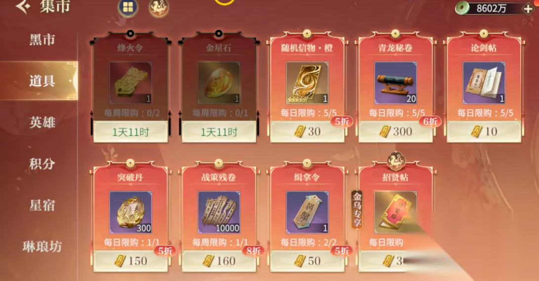 金镒的正确使用方式: 集市内的黑市中购买升级用的资源和抽卡道具,建议一般情况使用完五次免费刷新次数以后,再使用5次付费刷新是最划算的。