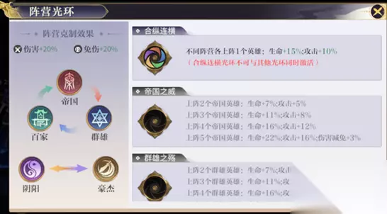 怎么搭配出一套适合游戏前期开荒用的阵容,游戏不同时期如何调整阵容呢? 我们需要了解一下英雄阵营属性加成与克制 游戏内的英雄主要分为五个阵容:帝国、百家、群雄、豪杰、阴阳;不同阵营之间属性是相互克制的,通过不同阵营的搭配可以达到不同的属性加成效果。