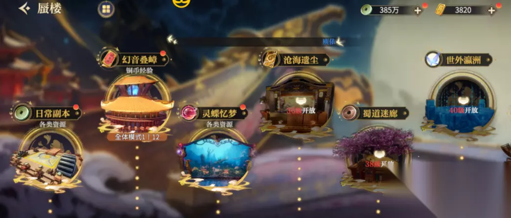 目前主要包括论剑,问鼎江湖,金戈演武等几个玩法,是目前玩家中热度最大的几个活动。不仅可以获得大量奖励,还能通过pvp战斗不断优化和调整出更强的阵容。 蜃楼副本 有很多的副本活动,包括日常副本、幻影叠嶂、灵蝶忆梦、沧海遗尘、世外瀛洲、蜀道迷廊、阴阳幻界、禁地试炼、屠戮之境等,都是可以获取金镒、抽卡道具、升级资源等大量游戏道具的活动。不同活动刷新时间不同,要注意刷新时间,避免忘记参加活动,浪费获得奖励的机会。