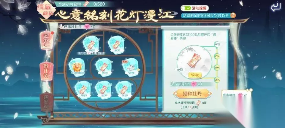 截止至5月29日,参与限时活动【心意铭刻 花灯漫江】,完成任务获得牡丹,播种牡丹点亮牡丹花灯,达到一定的播种数量可以领取旅行币&与你同行鞋子&唯有牡丹真国色趣味称号!