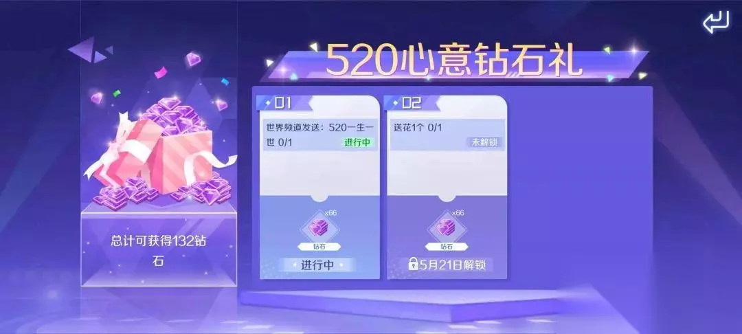 截止至5月22日,参与限时活动【520心意钻石礼】即可得132钻石好礼!