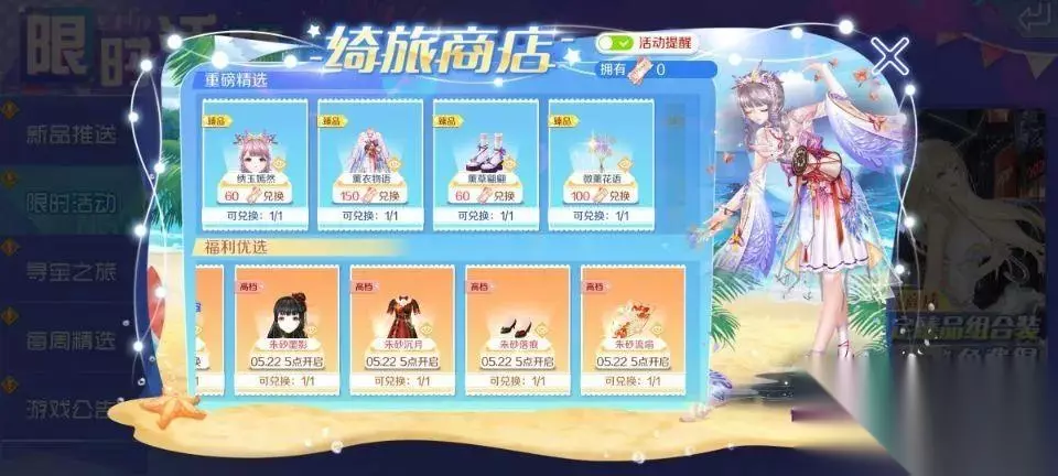 ▲时光商店美衣 09 绮旅商店持续上架中 高档组合装-朱砂沉月将于5月22日开启兑换~ps:小主人们完成任务获取旅行币即可前往兑换,活动期间资源不会下架。