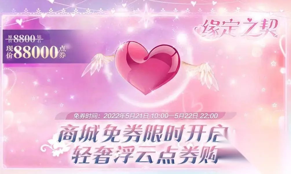 5月21日-5月22日,轻奢浮云-缘定之契在商城上架,售价为8800钻石,5月21日10:00商城免券购活动开启后,限时只需要88000点券就可以把浮云拿下啦~