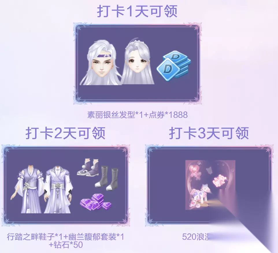 好礼送不停——当天登录游戏并成功分享即视为打卡成功,累计打卡3天还可得组合装&点券&钻石&520名片夹奖励!