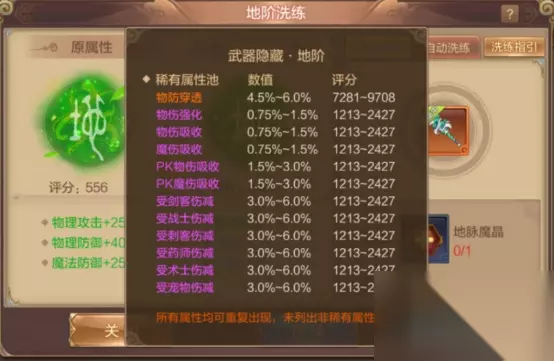 洗练过程中的随机属性有的侧重于PK,有的则是侧重于副本,所以小编简单的给大家一些小小的建议。 地阶随机属性中一般可以分为两大类:普通属性、稀有属性。天阶类似! 普通属性中包括:物攻、魔攻、物防、魔防、格挡、闪避等。 稀有属性包括:物防穿透、物伤强化、物伤吸收、魔伤吸收等。