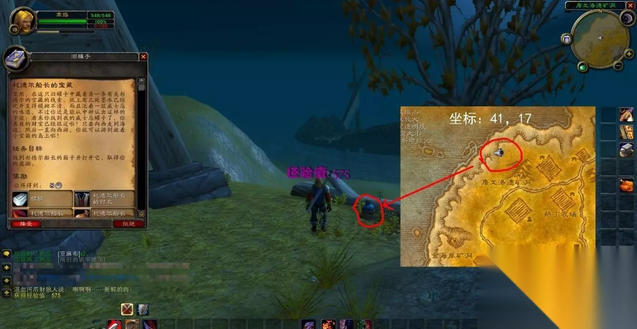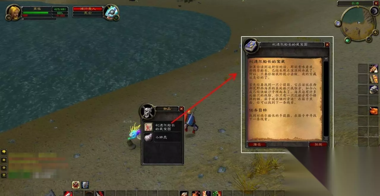 杉德尔船长的宝藏任务攻略 1、在西部荒野西侧的长滩海岸上砍鱼人,有一定概率掉落【杉德尔船长的藏宝图】,右击藏宝图会接到“杉德尔船长的宝藏”任务,要求玩家去找到小提箱,这个任务部落联盟都能接。任务描述中讲到了船只残骸、锈掉的锚,目标很明确。
