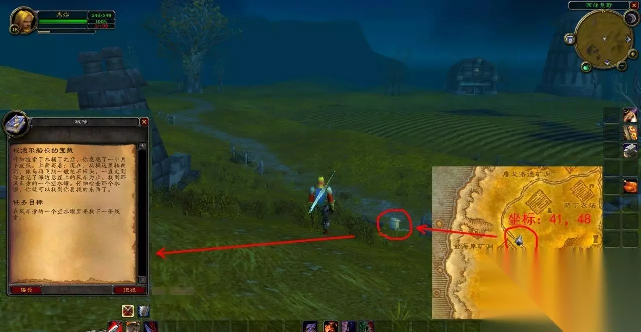 3、按要求向东走,在阿历克斯顿农场北面的小路边,找到了破烟囱,坐标是41,48。点击旧木桶交任务,接到后续任务,要求向北,在海边悬崖上找到风车,然后检查空水罐。