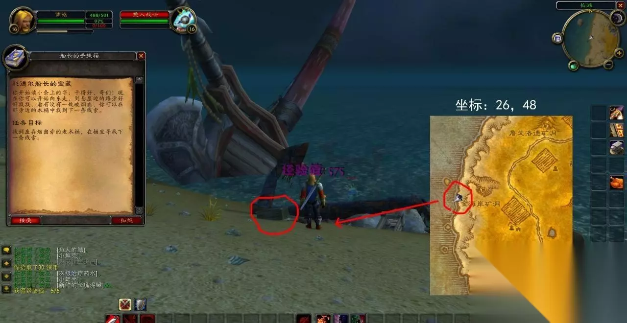 2、沿着海岸线找寻相应的参照物,在坐标26,48处发现目标。打开后交任务,继续接后续任务,要求向东走,找到破烟囱、水桶。