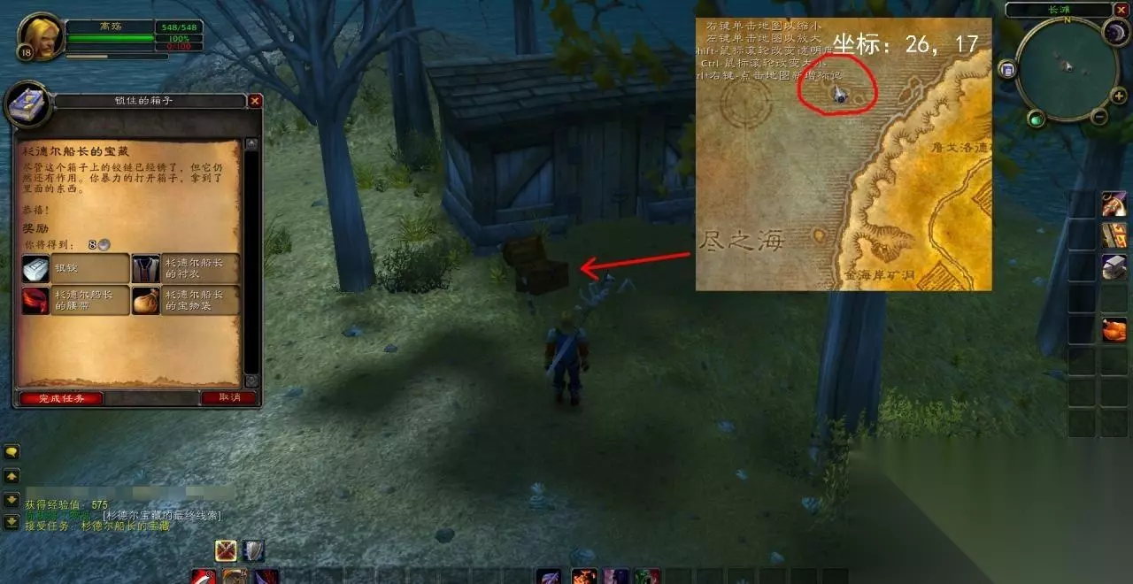 5、西边的小岛不多,在坐标26,17处的小岛上,有一间木屋,前面就放着船长的宝箱。压抑着兴奋的心,跑去开箱子交任务。共有4件奖品,分别是银锭一块,衬衣一件,腰带一根。还有一件叫做【杉德尔船长的宝物袋】——但是没有宝物,只是一个8格包包。