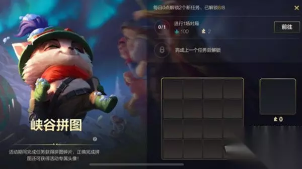 英雄联盟手游峡谷拼图活动攻略 背起行囊,拿上手册,提莫队长的峡谷游记开始了!帮助提莫队长一起完成峡谷拼图吧! 峡谷拼图已开启!完成任务获得拼图碎片,正确完成拼图还可获得活动专属头像! 活动时间: 2022年4月15日10点—2022年4月21日