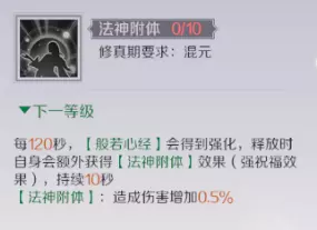 ● 法神附体:仙魔点充足的可以考虑 技能详情:每120秒,【般若心经】会得到强化,释放时自身会额外获得【法神附体】效果(强祝福效果),持续10秒。【法神附体】:造成伤害增加7.5%。 二、仙魔加点如下