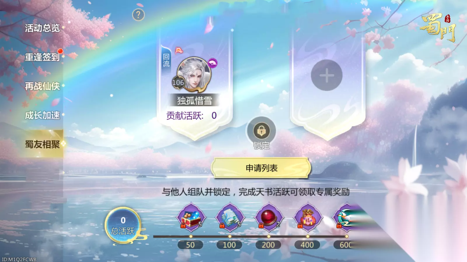 蜀友相聚 活动期间,将自动为回归玩家自动创建队伍,回归的蜀友可邀请其他非回归玩家组队参与活动;此活动最多支持2人组队,也可以单人组队完成任务。 锁定队伍后,将通过邮件发放锁定队伍奖励,蜀友通过完成天书活跃任务来获得专属奖励,其中总活跃达到指定值后即可领取玄云幻诀、珍稀资源自选包、专属仙章等超值好礼!