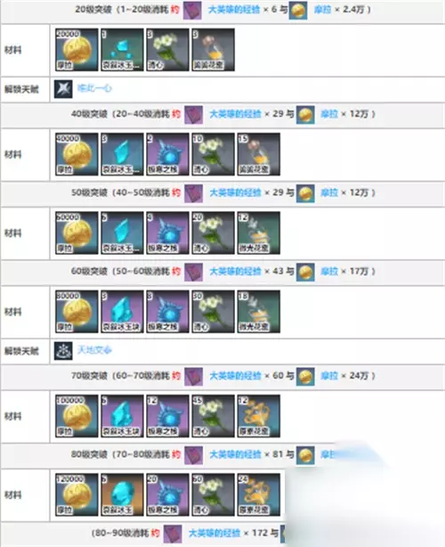 70级突破:哀叙冰玉快*6、极寒之核*12、清心*45、原素花蜜*12 80级突破:哀叙冰玉*6、极寒之核*20、清心*60、原素花蜜*24 哀叙冰玉和极寒之核可以通过急冻树、无相之冰、北风狼挑战奖励、魔偶剑鬼挑战获取;主要通过璃月野外采集;骗骗花蜜主要同过击败骗骗花获得。