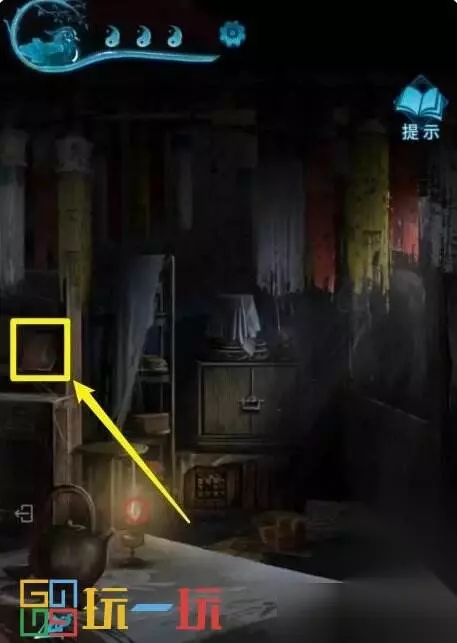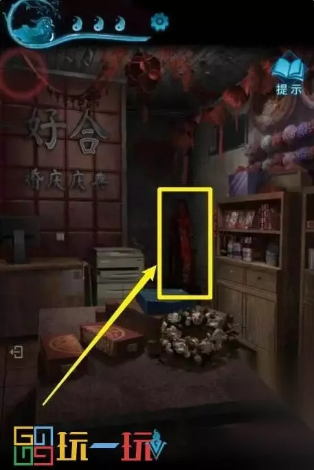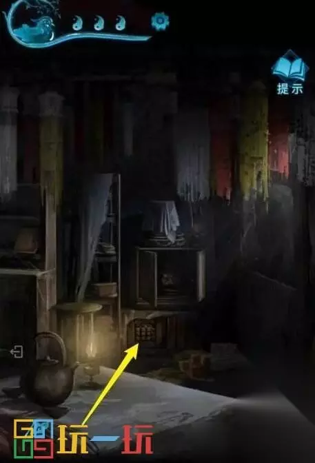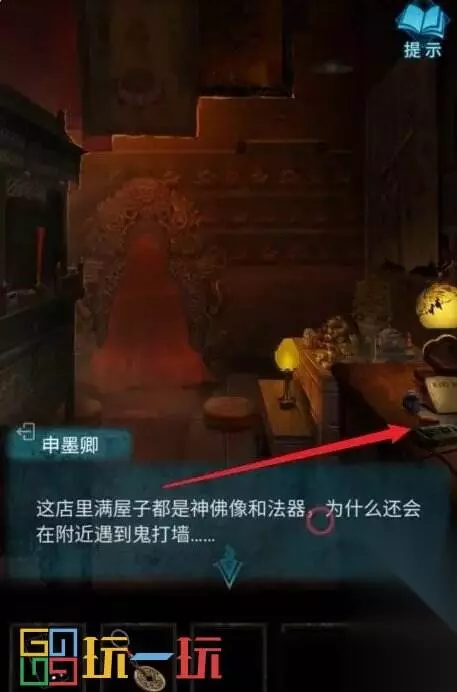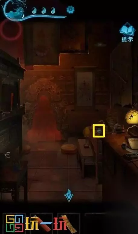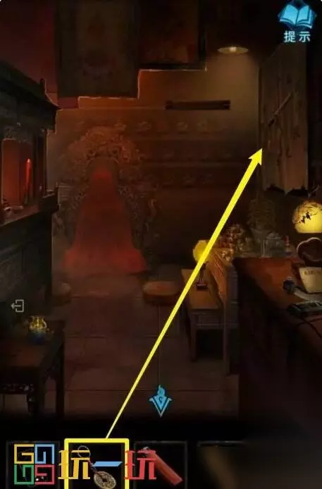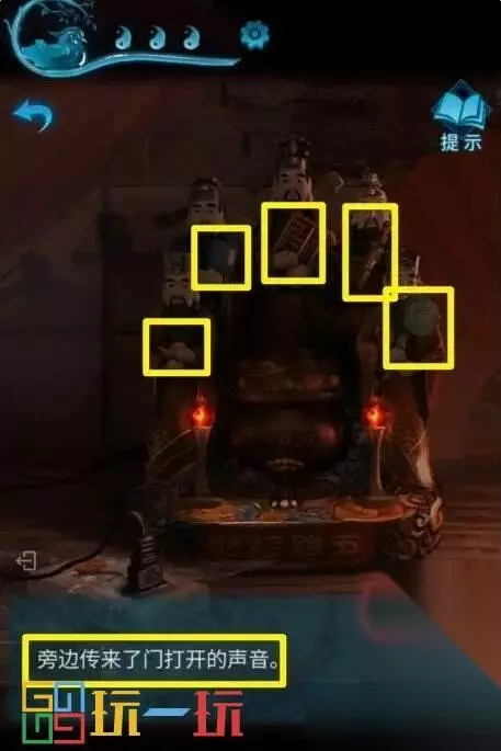 图27 28.点击左边的神龛,拿走【符咒】。