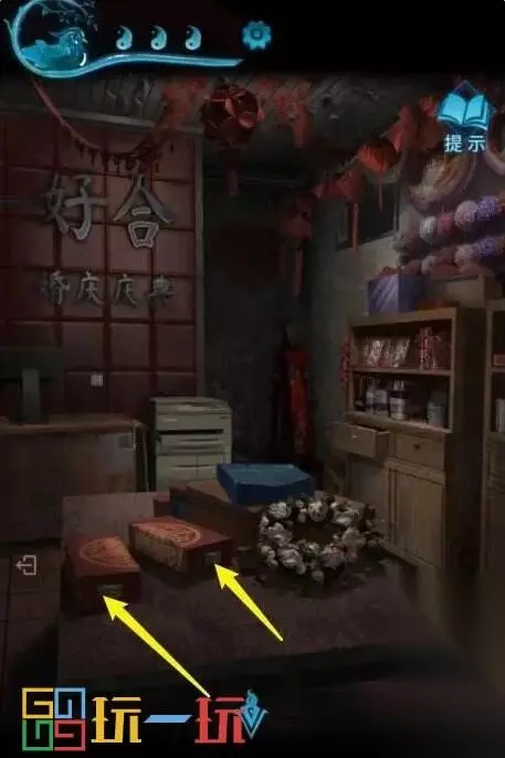 图44 45.回到婚庆店,点击桌子上的盒子,根据镜子中的线索结合盒子上的线索,依次点击对应的符号,打开两个盒子,得到【一捆香】【空白符纸】和【指甲剪】。