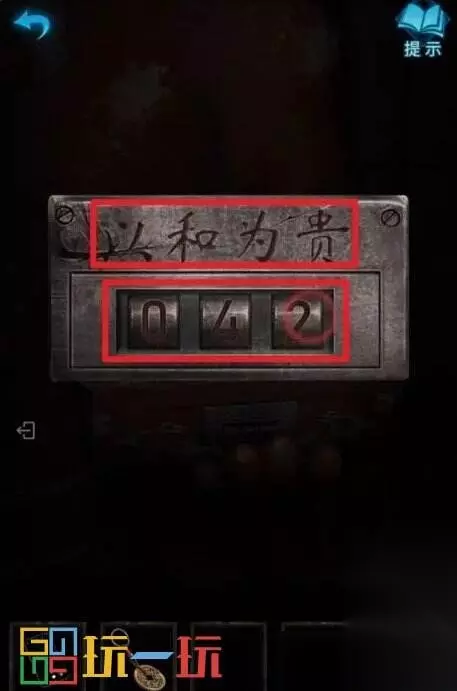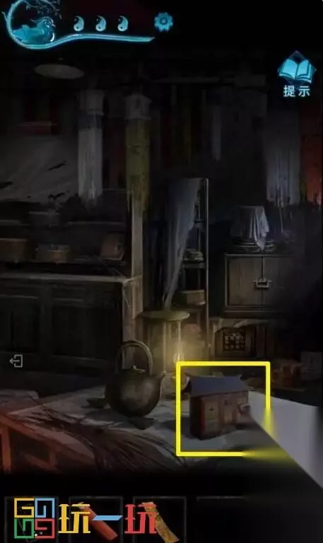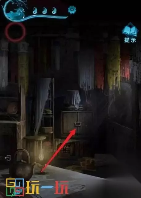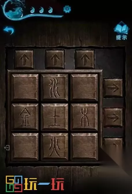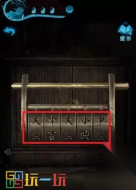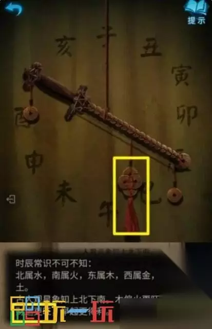 图42.1 43.点击前面的柜子,将【小零件】装进去,根据“六宝阁”风水书中的记载,排列文字(小游戏难度不高,解法不统一,个人解法是将土先放对位置,然后火、金、水、木依次挪对位置完成小游戏),打开柜门得到【拨浪鼓】。