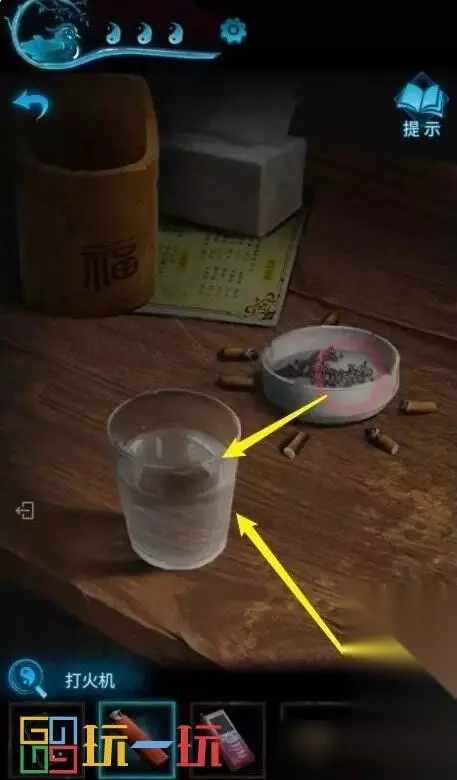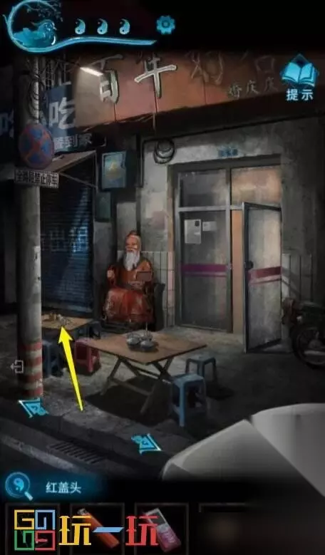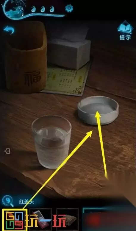 图40.1 41.返回店门口,剧情后再次点击桌子,将烟灰倒入水杯,使用【红盖头】蘸烟灰水,得到【浸水盖头】。