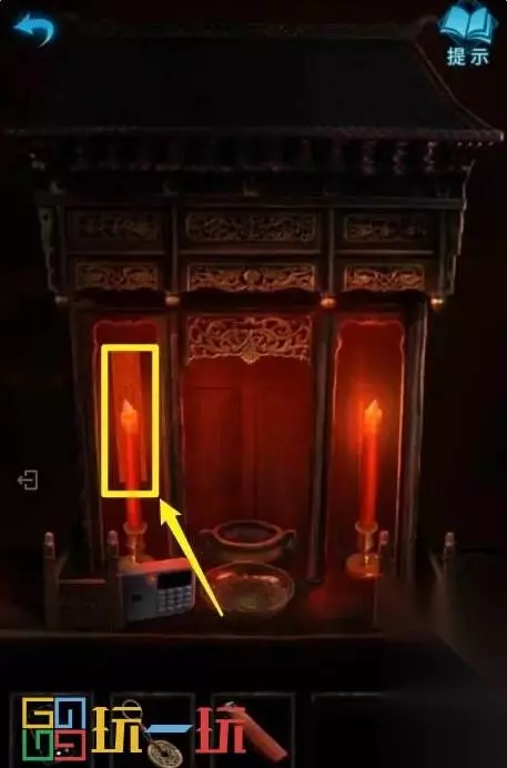 图48 49.返回“六宝阁”,点击左边的神龛,在碗中点燃【纸扎寺庙】,香炉中插上六炷香并点燃,左右两边都贴上【符纸】,剧情过后,第二章结束。