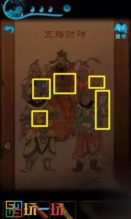图29.1 30.五路财神画像展开,获得【小金鞭】,点击画像,记住画像中五位财神手中的物品和对应的位置。