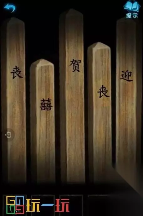 图21 22.来到婚庆店门口,点击右边的桌子,将筷子上的字按照:“丧、囍、贺、丧、迎”摆放,得到【吊坠】。
