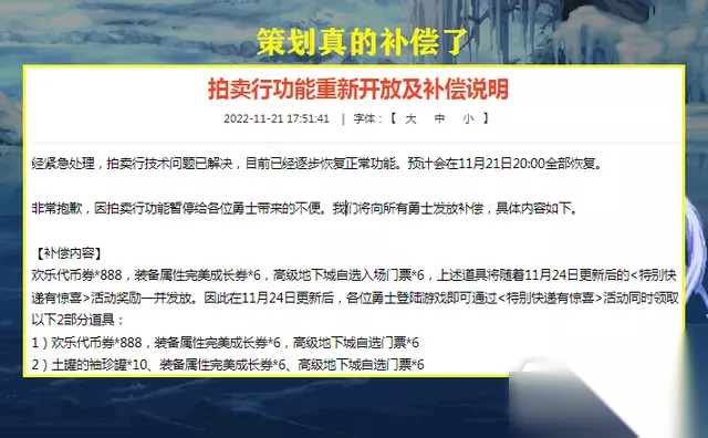 由此可见的,因拍卖行的问题,策划送了欢乐代币券888点,装备属性完美成长券6张,高级地下城自选入场门票6张。同时要注意了,24号版本更新后,还有【特别快递有惊喜】活动,也能领取3大奖励:土罐的袖珍罐*10、装备属性完美成长券*6、高级地下城自选门票*6。