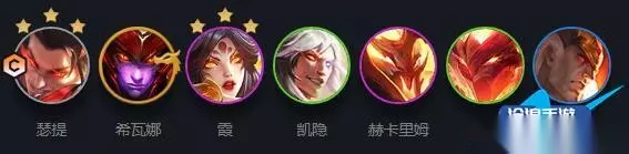 1、阵容组成:凯隐、慎、奇亚娜、戴安娜、泰隆、赫卡里姆、奥恩 2、阵容羁绊:4刺客3怒翼龙2格斗 3、巨龙圣坛(强化符文):割喉之战+羽量级选手II+直击弱点/DD街区+开摆+羽量级选手I 4、装备搭配: 主C凯隐:无尽之刃+死亡之刃/水银>夜之锋刃>巨人杀手 慎:狂徒铠甲+日炎披风 奇亚娜:冰霜之心