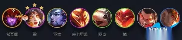 1、阵容组成:泰隆、霞、赫卡里姆、慎、奇亚娜、图奇、奥恩、瑟庄妮、亚索 2、阵容羁绊:3冒险3怒翼2狂刃 3、巨龙圣坛(强化符文):强攻+并肩作战II+迅捷射手之冕/最佳好友II+实战训练I+迅捷射手 4、装备搭配: 主C霞:无尽之刃+巨人杀手/水银>正义之手>鬼索的狂暴之刃 泰隆:巨人杀手+无尽之刃+饮血剑 赫卡里姆:棘刺背心+莫雷洛秘典 慎:救赎+钢铁烈阳之匣 奇亚娜:冰霜之心 图奇:基克的先驱 5、阵容站位: