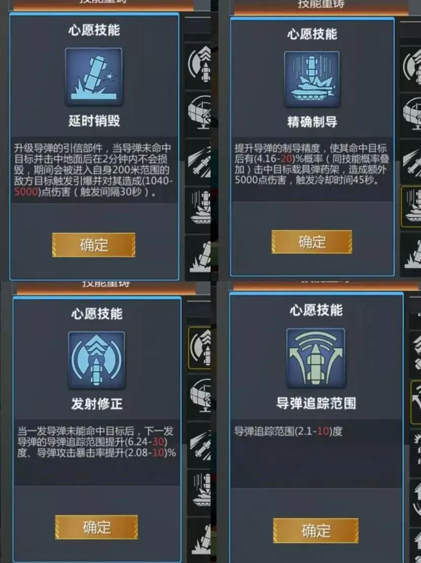 技能方面选择这四款。如果选择延时销毁的话建议两个都刷延时销毁,精确制导同上。