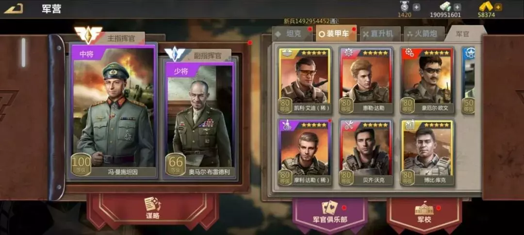军官全五星即可,车长与射击手可以换稀有,夏日活动中有条件也可以换战神车组,这里不多赘述。指挥官方面副指挥官只推荐光头(布雷德利),有条件可以隆美尔副指挥官,主指挥官维特,魔术师(高端局),鹰眼都还可以,有条件可以像我一样曼施坦因主指挥官(锁只有满阶才好用)。