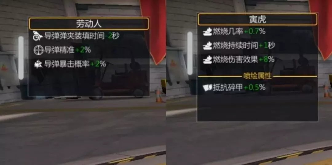 对悍马S来说军需红五星武器就够用了。机枪方面由个人喜好选择燃烧或配损机枪,燃烧不必多说可以消耗敌方载具血量,而配损有时可以打停敌方载具从而更好的进行导弹打击。技能方面燃烧机枪选择机枪攻击燃烧概率,配损机枪选择机枪攻击配件损坏概率。不过不可忽略的前提条件便是:由于只有一把机枪,触发上述效果的概率也会降低很多。