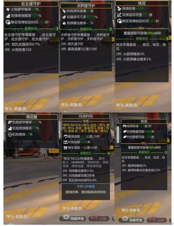 由于没有能够减少导弹冷却时间的贴花选项,因此在这个方面不做过多推荐,大家有什么就用什么就好。上面几款是我列出适合悍马S的贴花,其中棉花糖获取难度较大需要扭蛋,两个星座守护是23年的战令不一定所有人都有,专属的话推荐1114的贴花去贴,好处就是如果小氪一手可以买个机枪或者导弹1114专属去凑齐两件套导弹暴击概率的组合。25年战令的桃花是比较好的,桂花也不赖,所以个人选择为主。