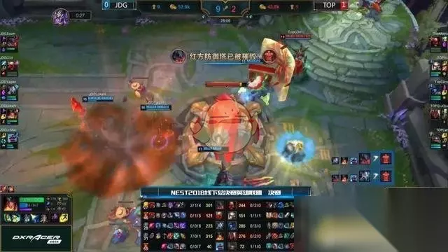【战况】 [05:30] 布隆闪现q挂被动留住,剑魔tp下来封路,希维尔拿下金克斯一血。 [09:20] 酒桶回家,TOP中野来到上路包夹塞恩,青钢影先手大招框住,加里奥大招落下完成击杀。 [14:20] TOP推掉上路一血塔。 [22:28] 塞恩大招先手开团,布隆反手大招击飞,塞恩被先手集火击杀,但希维尔被妖姬侧翼偷掉,双方打出3换3。 [26:15] 青钢影钩锁进场大招留住酒桶,酒桶大招炸飞青钢影,塞恩大招逼退,青钢影被妖姬点燃收掉,JDG大龙逼团打出0换3后再次rush并成功拿下大龙。 [28:53] 锤石q钩到布隆,布隆被集火先秒,塞恩大招进场,金克斯被加里奥嘲讽塔下击杀,TOP反打成功1换2。 [37:00] TOP在野区逼出塞恩板甲,青钢影钩锁进场r到金克斯,加里奥接上大招击飞四人,金克斯复活甲过后还是被击杀,TOP开团成功打出3换4,拖掉龙buff。 [43:41] JDG中上在中路,TOP选择包夹JDG下野,剑魔开启大招进场但被锤石e推回踩夹子,打出大招,青钢影钩锁进场但被塞恩挡住只能原地大招,金克斯无压输出打出1换2后拿下大龙。 [45:48] 双方站位远古龙坑,妖姬在偷中路水晶,塞恩大招先手开团留人,青钢影再次被击杀,金克斯被动加速收获四杀,JDG一举推进推掉水晶结束比赛,恭喜JDG拿下NEST冠军。