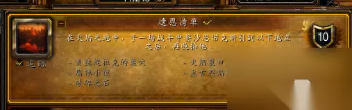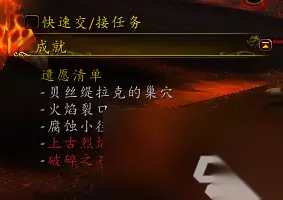 [遗愿清单]:要求在与BOSS-【沙恩诺克斯】的战斗中将其引到火焰裂口、腐蚀小径、破碎之石、贝斯缇拉克的巢穴和上古烈焰群山之后再击杀他。 BOSS需要召唤 在副本看到这些群怪,打掉之后,直到聊天频道中出现,