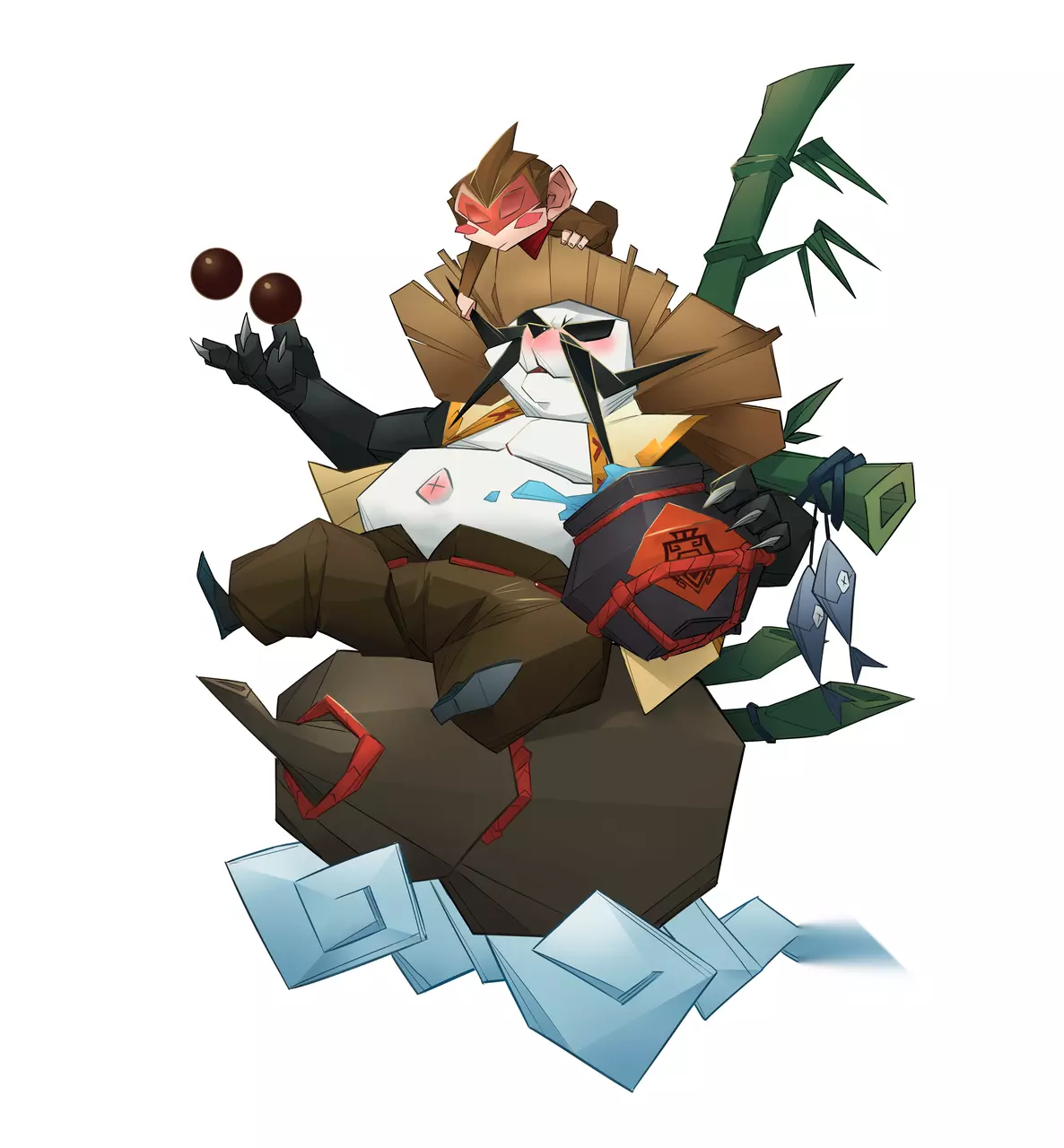 在立绘的设计上,道友们可以看到熊猫酒仙的身上存在有非常多的酒元素,身下的酒葫芦,手中的酒缸,以及肚脐和脸庞因醉酒而呈现出的红晕,手上还在盘球,整体状态看上去非常松弛,展现出熊猫酒仙心态上的转变,从一心只想报仇的血气方刚,到如今隐于山林的枯荣随缘,可谓是“过往无归路,终究是过眼云烟”。 另外,熊猫酒仙的身后背着竹子,头上趴着一只可爱的小猴,这些代表巴蜀的元素也展现出他与巴蜀之地深深的羁绊,熊猫酒仙守护此地千年,蜀中百姓都尊称他一声“熊猫大仙”,他也成为了人们口中的传说!