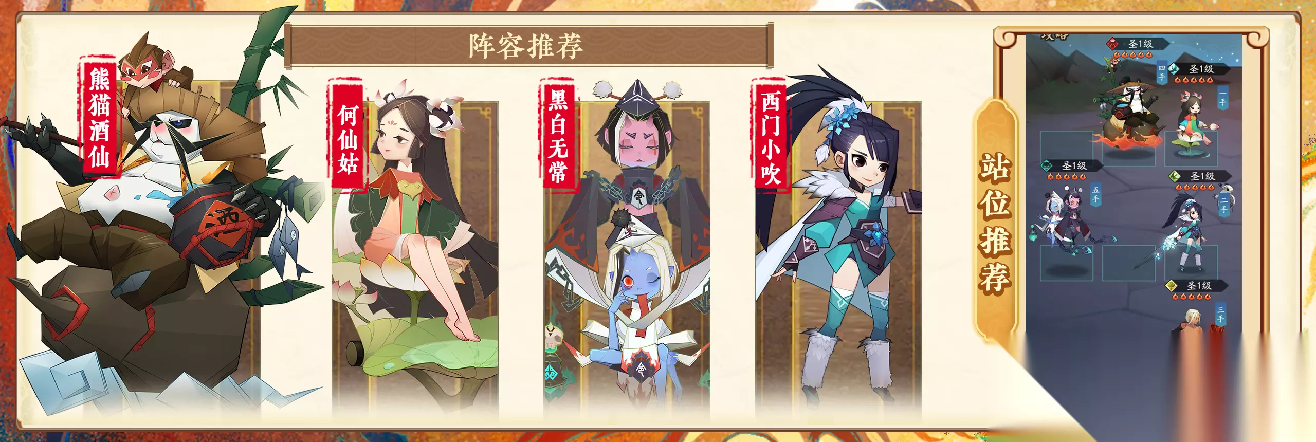 阵容配合:以熊猫酒仙为核心的续航流派,熊猫酒仙自身强度极高,能施加灼烧降防,分身有控有回血,天相复活后自身强度还可再度成长,何仙姑提供回气增益,黑白无常攻守兼备,西门小吹作为坦克功能性十足。 阵容解析:西门小吹可嘲讽对位目标,天相提供伤害免疫,;何仙姑与黑白无常为团队提供气势恢复和治疗增益,还可干扰敌方进攻节奏。 天相推荐:熊猫酒仙——重生蜕变;何仙姑——步步生莲;黑白无常——阴阳结界;西门小吹——人剑合一 字灵推荐:熊猫酒仙——星火燎原;何仙姑——悬壶济世;黑白无常——星火燎原;西门小吹——铜墙铁壁 熊猫酒仙+宝莲仙童+九黎兵主/灭世之刃+不死凤凰+主角
