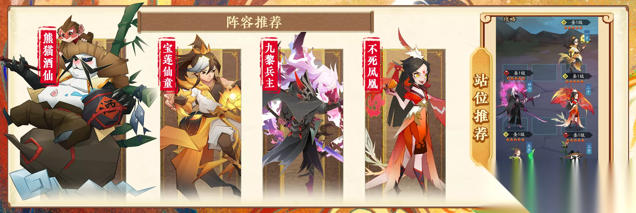 阵容配合:以熊猫酒仙为核心的爆发流派,熊猫酒仙自身强度极高,能施加灼烧降防,分身有控有回血,天相复活后自身强度还可再度成长,宝莲仙童链接己方分摊伤害提供最高容错,九黎兵主或灭世之刃造成高额AOE爆发,不死凤凰兼具输出治疗还能造成重伤效果。 阵容解析:宝莲仙童以治疗和伤害分摊作为团队生存的主要保障;九黎兵主/灭世之刃配合熊猫酒仙令敌方快速减员,不死凤凰挂上重伤使敌方难以从重创中恢复。 天相推荐:熊猫酒仙——重生蜕变;宝莲仙童——神灯高照;九黎兵主——狂战;不死凤凰——业火灼烧 字灵推荐:熊猫酒仙——铜墙铁壁;宝莲仙童——悬壶济世;九黎兵主——星火燎原;不死凤凰——星火燎原