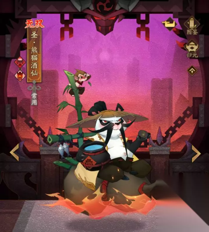 熊猫酒仙在立绘的设计上,无不透露出他的过往经历,真是饱含“故事感”啊!你别看熊猫酒仙天天喝酒像个醉汉一样,人家的战斗力那可是不减当年半分! 熊猫酒仙技能介绍 熊猫酒仙逃至巴蜀后隐居山林,独自修行,曾经与蚩尤并肩作战的那些日子现在都成了他的谈资,残酷的战争被云淡风轻地从口中说出。他不老不死,对天下兴亡都已麻木,唯有歹人残害此地时,才会激起他的血性。熊猫酒仙守护蜀地千年,也见证了蜀中百姓无数的悲欢离合,唯有酒精才能短暂地麻痹他的感知。 战法:三才焰火 熊猫酒仙痛饮烈酒,喷出火焰对敌方全体进行攻击,凶猛的烈火彷佛要吞没一切,万物都将化成灰烬,造成极强的攻击伤害并附带灼烧效果,使敌人每回合损失此次伤害一定比例的生命值并降低一定命中,处于灼烧状态下的敌人,每次受到灼烧伤害时,防御会有所降低。
