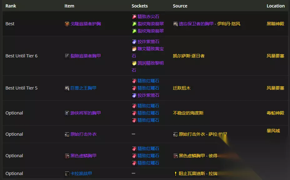 要是挑胸部装备的话,戈隆追猎者护胸是首选呢。至于附魔嘛,胸甲的附魔推荐用“附魔胸甲 - 杰出属性”。