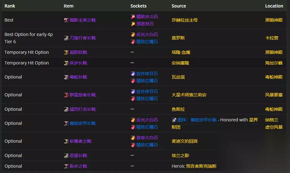 脚的装备呀,暗影主宰之靴是首选哦。至于附魔呢,附魔长靴 - 灵巧是比较推荐的。