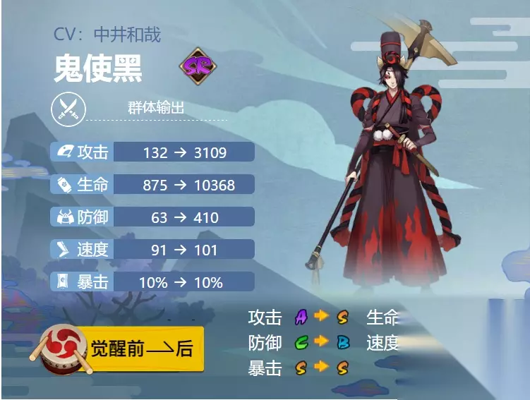 阴阳师鬼使黑御魂怎么搭配 方案一:破势×4,荒骷髅×2 御魂位置: 2号位:攻击加成 4号位:攻击加成 6号位:暴击 点评: 1、满暴尽量带点速度,绝对不亏,这样搭配可以打出高额树池,强化压血线的能力,以后还可以转换掉。 2、没有荒骷髅带暴击和歌姬也行,触发歌姬可以高伤害,收大怪,搭配鬼灵歌姬收小怪。 方案二:狂骨×4,暴击×2 御魂位置: 2号位:攻击加成 4号位:攻击加成 6号位:暴击 点评: 鬼使黑,典型的输出式神,对御魂的要求也不算高,万金油式神。 式神技能 技能一:惩戒(0火)