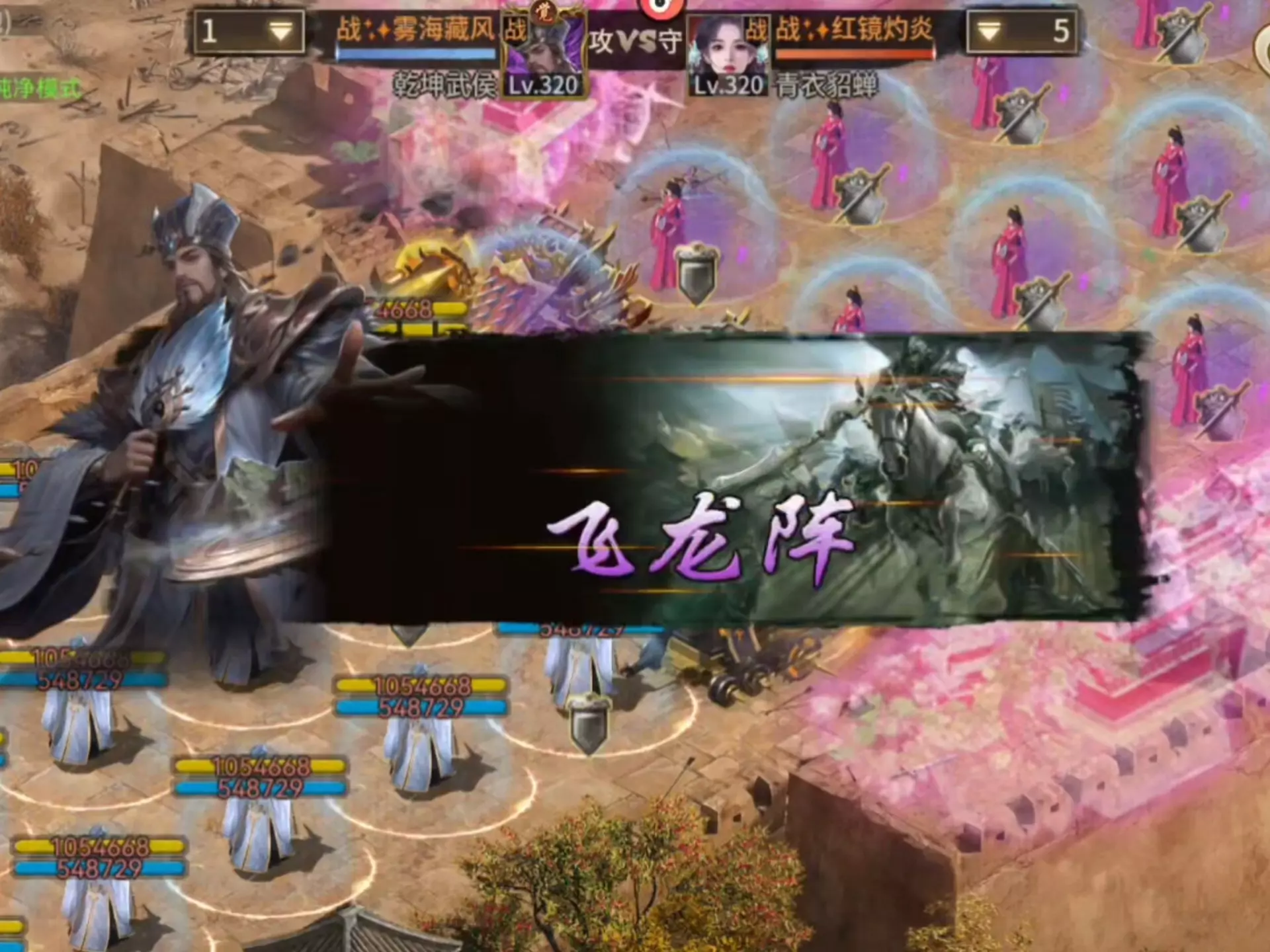 这是一篇三国类对战游戏的对战帖,展示了320级的汉寿亭侯阵营对战320级的乾坤武侯阵营的战斗过程,战斗中汉寿亭侯阵营释放技能“水淹七军”,双方展开激烈攻防。