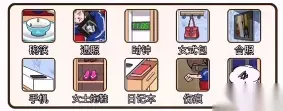 我们可以在房间中找出一些蛛丝马迹: 桌上四双碗筷、女孩手中的遗照、墙上的女士包、桌上的合照、 桌上的收集、女士拖鞋、抽屉里面的日记本,女孩手腕上的伤痕, 墙上的时钟、点击小女孩头上会出现气泡。 2、我们可以找到如下图所示的这些物品: