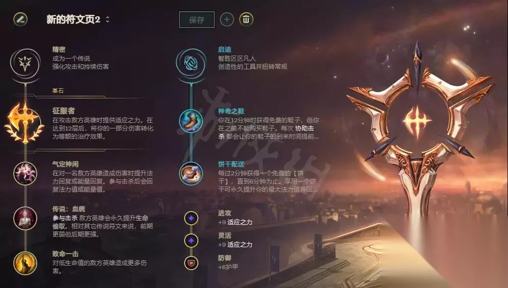 英雄联盟杰斯天赋符文推荐 基石符文方面首选征服者,征服者是杰斯对抗猴子这类会突脸的近战英雄的本钱,没有征服者杰斯就算是锤形态也很难在对拼中取得优势。而打远程英雄时,杰斯作为双形态拥有六个技能的英雄,叠征服者速度极快,也能有着不错的收益。