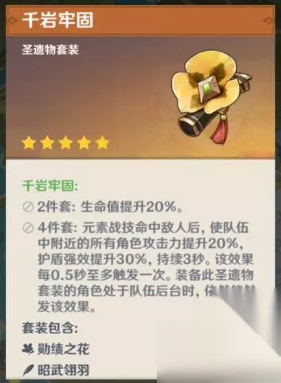 二、圣遗物套装推荐: (1)千岩牢固四件套: 大多数情况下都是选择此套装,辅助用的,提供全队20%攻击力,美中不足的就是E技能伤害范围有点小,容易吃不到加成