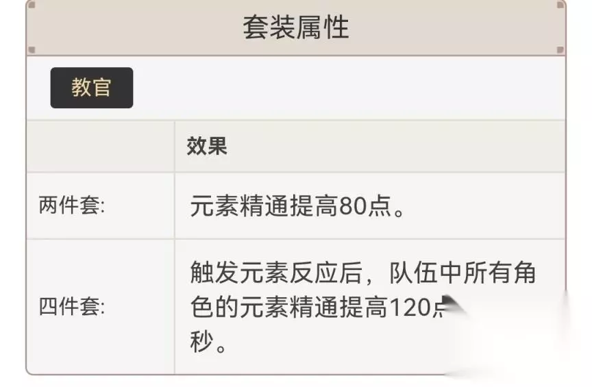 (5)教官四件套: 胡桃队用的比较多,或者草国加钟离的情况下也可以带,只要是吃反应的队伍就行