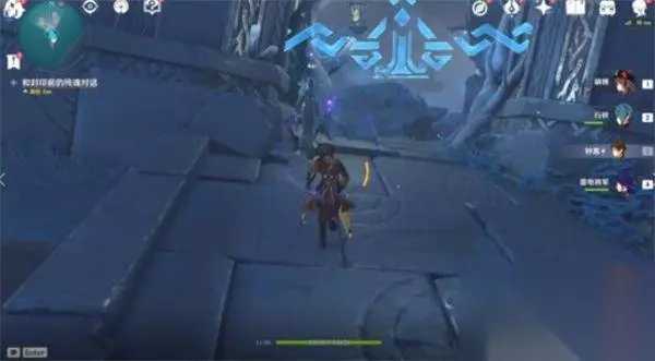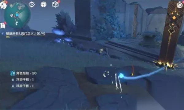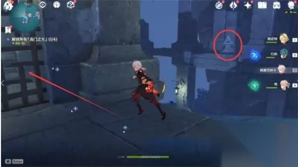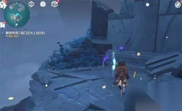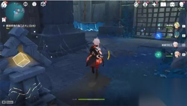 4、黑夜状态来到指定位置,我们用火系角色分别点亮四个雕像脚下的火盆。刷新四波怪物,我们最好带个破水盾的冰系角色,我们打完架后触碰四个大雕像手中的高门之火,即可完成任务。