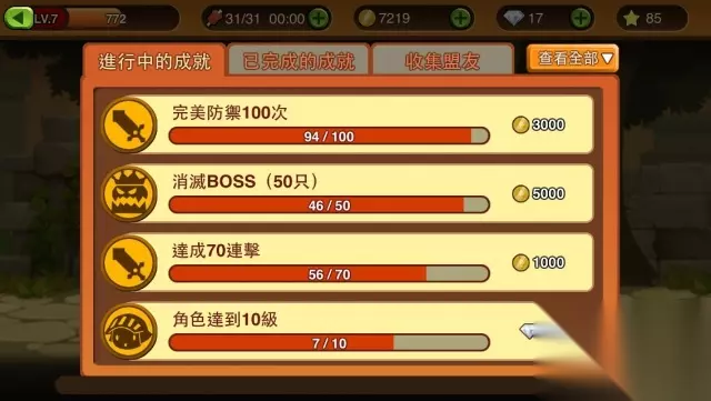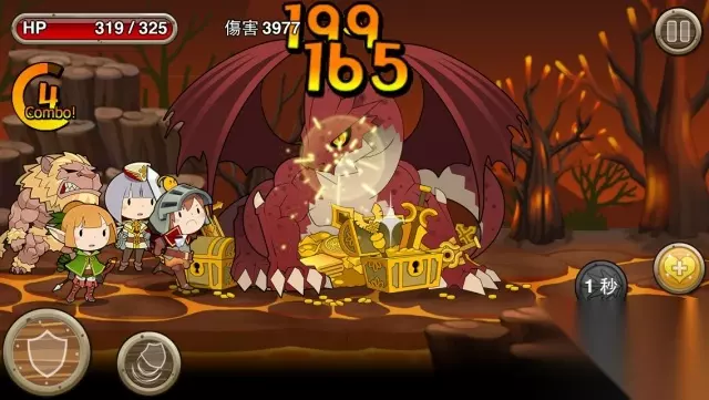 选择适当的伙伴,就能大幅增加 闯关的成功率 游戏采用了横向闯关的方式,每次闯关时,玩家最多可带领三位盟友协助玩家战斗,而游戏的操作方式十分简单,玩家无须控制人物移动,角色们会自动向前方前进,只要适时防御、攻击就行了。 在画面左下角有盾牌格挡及飞盾两个按钮,盾牌格挡使用后可减少怪物们攻击的伤害,而飞盾则是可以攻击上方的敌人;画面右下角则有普通攻击以及盟友附带的技能攻击,玩家只要运用这些基本操作技巧就能顺利通过关卡。