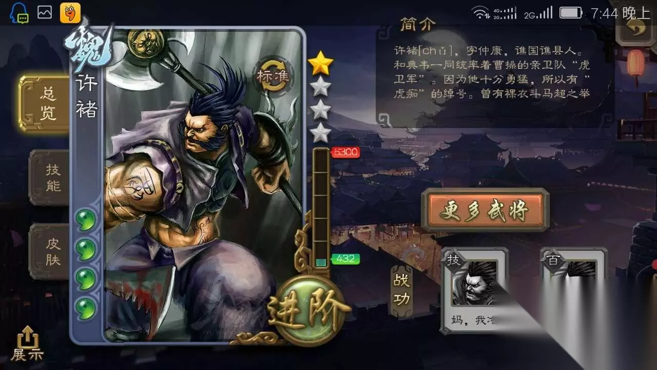 【字】:仲康 【籍贯】:豫州谯国谯县[今安徽亳州] 【官至】:武卫将军、 牟乡候,死后追封为壮候。 【勾玉】:4勾玉。 【许褚台词】 1、裸衣:谁来和我大战三百回合! 2、阵亡:冷,好冷啊…… 【许褚技能】:裸衣,摸牌阶段选择少摸一张牌,该回合“杀”和“决斗”对目标的伤害+1。