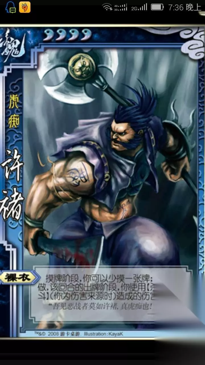 【使用心得】: 1、如果摸到决斗和杀,情况要是不太危急的话不要急着使用,我们应该观察场上的形式,通过这一回合的观察,判断谁手机又闪,为下一回合裸衣的发动做出铺垫!蓄杀是很好的选择。留着过河拆桥,顺手牵羊,无中生有,这样在下一回合中既可以消耗他人的牌,又可以补充自己的牌! 2、青龙偃月刀、诸葛连弩是很适合许褚的,青龙偃月刀能够连续对一人出杀,直到杀命中对方,有杀就行,因为一般人要是手牌不多的话只留一闪来保护自己,当然,遇到赵云就要小心了,【龙胆】让赵云面对许诸无所畏惧,诸葛亮的【空城】也是克制许褚的技能之一。我们就要就要控他们的手牌。诸葛连弩对许褚来说是神兵利器,越多的连杀就会有越高的伤害! 3、搭配方面刘备是一个好队友,【仁德】可以辅助许褚的爆发。甘宁的【奇袭】可以极其有效削弱对方,张辽的【突袭】也和甘宁有异曲同工之妙。 4、裸衣其实也是有很大限制的!怕被乐不思蜀,怕碰到拆迁大队的甘宁和张辽,怕万年牢王大乔,碰到他们,常常导致前期的准备功亏一篑。如果有无懈可击就会安全一点。这个时候就更要注意观察了!要是可以通过前方的互相杀闪,还有万箭齐发判断谁有闪,谁没有闪! 5、若是对手有裸衣,我们该怎么办呢?很简单,尽量就这闪,若是有人一点基础伤害来攻击你,可以选择受伤,当许褚裸衣时,我们可以躲开两点的伤害。